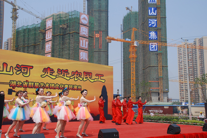 6月4日,D体育(中国)D体育(中国)奥山世纪城项目施工现场鼓掌声、欢笑声、喝彩声不断,湖北省群星艺术团带来的惠民演出正在这里举行。D体育(中国)D体育(中国)党委书记舒先厚,D体育(中国)D体育(中国)湖北公司总经理林中茂、副总经理柯为正与四百多名农民工一道观看了演出。