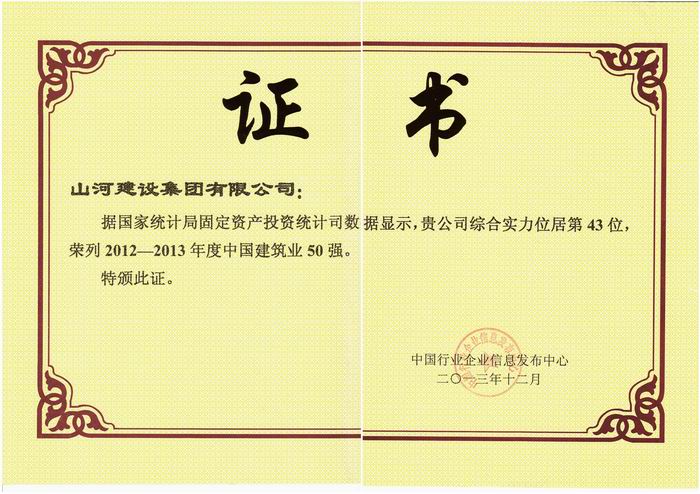 由国家统计局提供最新权威数据支持,中国行业企业信息发布中心主办的“2013第十二届中国建筑业50强测评成果发布暨颁奖典礼”于2013年12月在京举行。会上发布了中国建筑业50强名单,D体育(中国)D体育(中国)位居第43名,提前两年实现了D体育(中国)D体育(中国) “二五”目标中的该项指标。