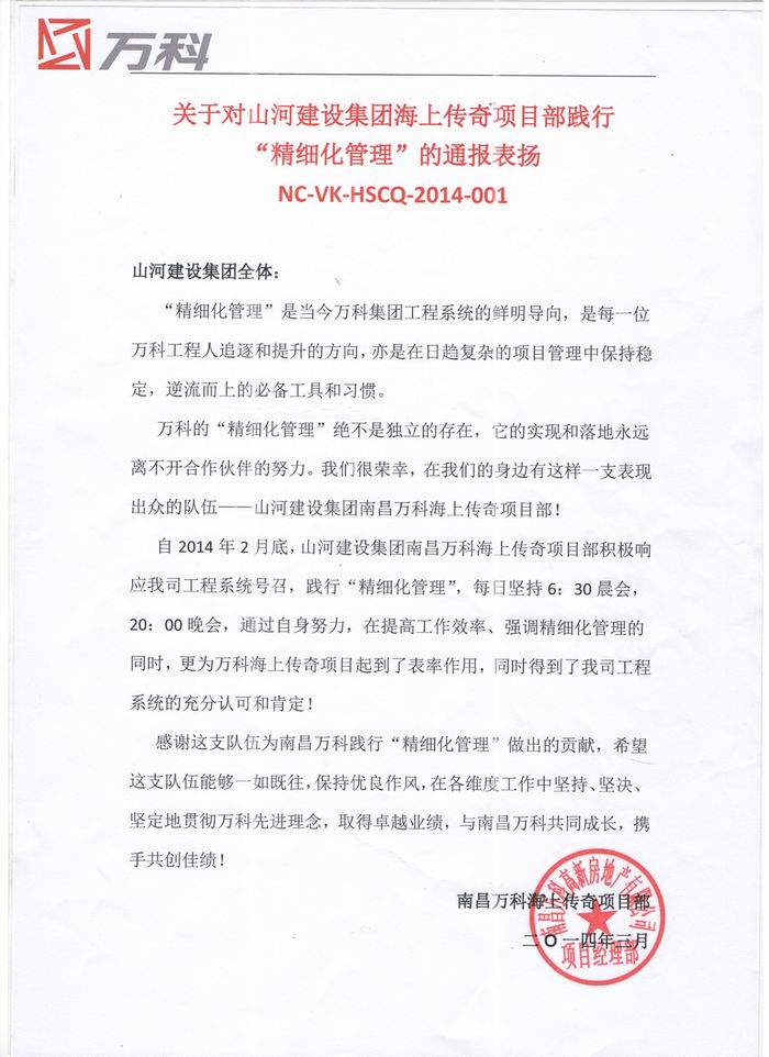 在熊善杰的带领下,项目部响应号召,积极实践精细化管理,将管理目标和责任分解、细化、层层落实。项目部每日6:30晨会,20:00晚会,坚持工作日清日结、落实到位,发现问题及时纠正、及时处理。在提高工作效率的同时,他们为万科海上传奇项目起到了表率作用,得到了万科地产的充分认可和肯定。