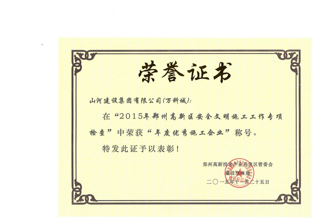 11月25日,在郑州高新区安全文明施工专项检查中,D体育(中国)建设D体育(中国)有限公司荣获由郑州高新区管理会建设环保局授予的“年度优秀施工企业”荣誉称号。