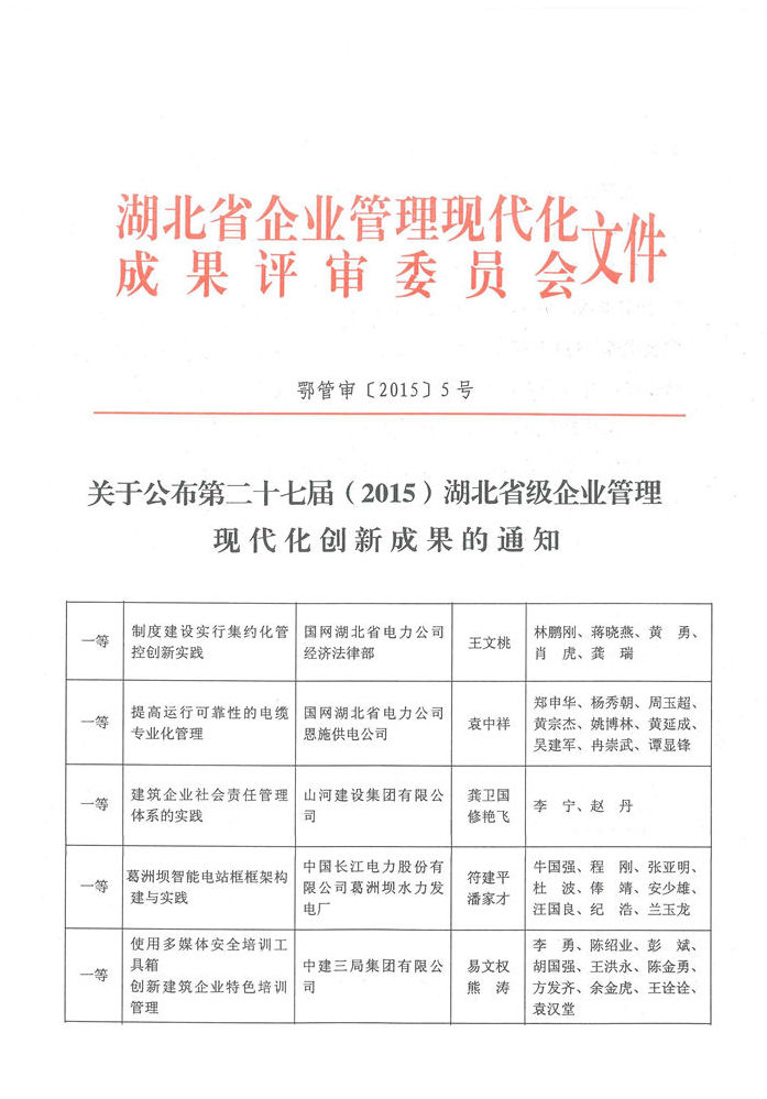 2015年12月25日,湖北省第二十七届(2015)企业管理现代化创新成果名单公布,D体育(中国)D体育(中国)申报的《建筑企业社会责任管理体系的实践》成果荣获一等奖。