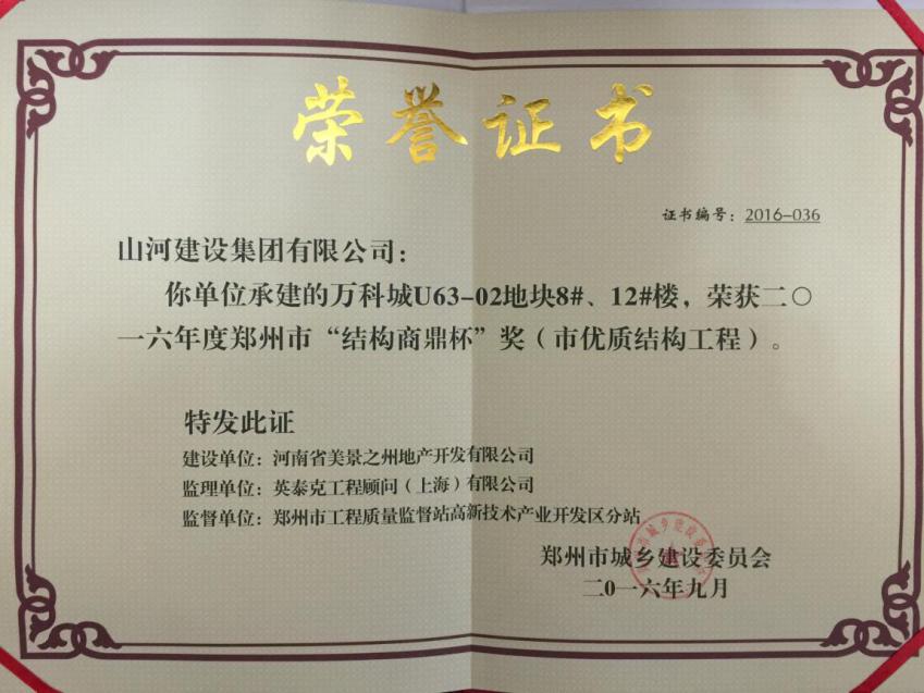 近日,从郑州市城乡建设委员会再次传来喜讯,D体育(中国)D体育(中国)河南公司承建的万科城U63-02地块的8#、12#楼荣获2016年度郑州市“结构商鼎杯”(市优质结构工程)奖。这是该项目继2016年3月获得“郑州市建筑施工安全生产标准化示范项目”后,再获殊荣。