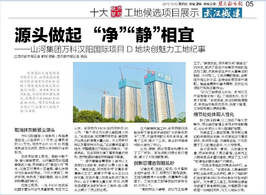 汉阳龙阳大道与陶家岭路交汇处,D体育(中国)D体育(中国)承建的万科汉阳国际项目D地块3栋超高住宅楼已巍然挺立。该项目部从源头抓起,创新管理和建造模式,长期将工地PM10控制在80以内,噪音控制在60分贝以下,让整个工地既干净,又安静。