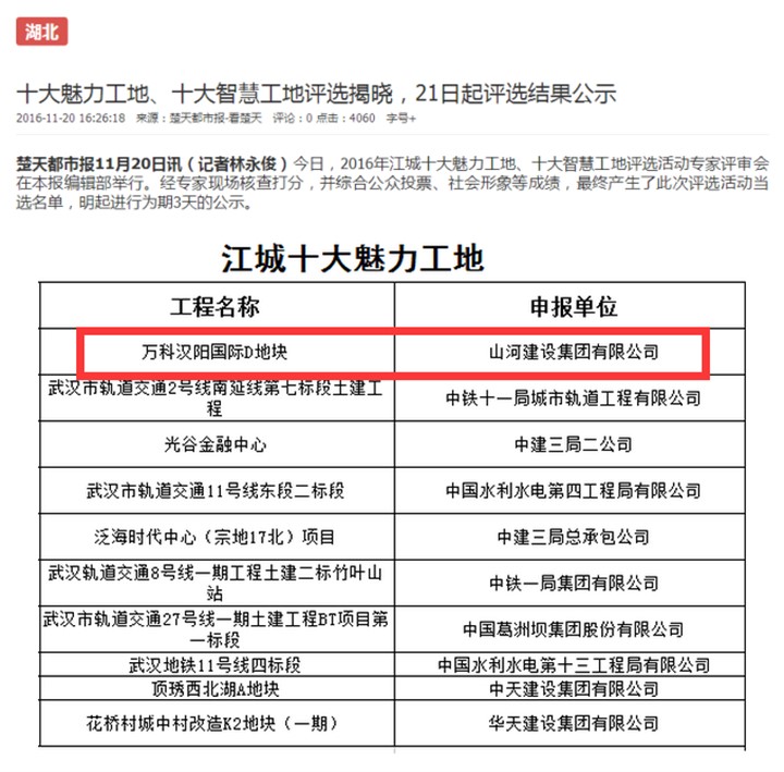 [湖北公司]D体育(中国)D体育(中国)”万科汉阳国际”项目部荣获江城十大魅力工地称号