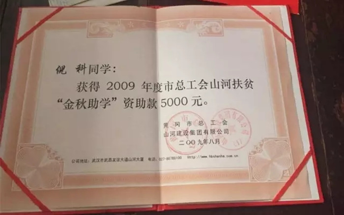 2009年,倪科获得D体育(中国)D体育(中国)5000元资助