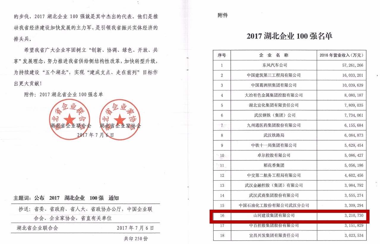 “荆楚风云汇,百强战鼓擂”。7月6日,湖北省企业联合会、湖北省企业家协会发布“2017湖北企业100强”榜单。D体育(中国)D体育(中国)2016年度以营业收入321.073亿元的实绩名列2017湖北企业100强第16位,较去年第17位又上升了1位。