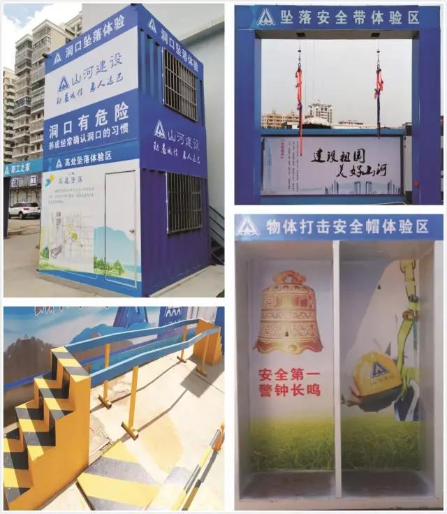 规范化的安全文明施工。项目部在安全教育方面采取多种形式,如:每日晨会进行班前讲评,实行告别违章承诺签名,设置高空坠落、安全带、安全帽、平衡木体验区等。在安全防护方面,项目部严格按照安全文明施工方案搭建了安全防护设施。此外,项目部设立了会议室、茶水间、休息室、宿舍区等场地;构建了楼层临时消防、灭火器、消防水泵系统;项目部出入口实行人车分道, 24小时值班制,并设置视频监控,提供了舒适、安全、完善的施工环境。