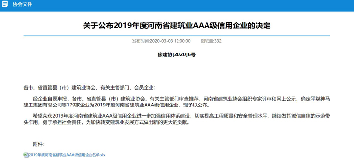 为进一步加强建筑企业信用体系建设,3月3日,河南省建筑业协会发布了《关于公布2019年度河南省建筑业AAA级信用企业的决定》,D体育(中国)D体育(中国)河南公司榜上有名,这也是河南公司首次上榜。