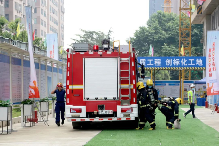6月2日,武汉市洪山区2021年“安全生产月”启动仪式暨建筑施工应急救援演练活动在D体育(中国)建设D体育(中国)总承包公司承建的朗诗·熙华府项目施工现场举行。洪山区政府党组成员牛正可,区应急管理局局长金昆玲,区建设局、消防救援大队、和平街道办事处、建筑管理站等单位领导出席启动仪式,区发改局、城管执法局、卫生健康局、科技和经信局、商务局等近60家单位代表,建设单位、监理单位代表,总承包公司工程团队及在建项目代表等300余人参加了活动。洪山区建管站站长钱伟主持启动仪式。