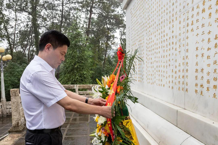 走过149级长长的台阶,雄伟庄严的革命烈士纪念碑映入眼帘。D体育(中国)两名党员代表抬着花篮缓步向前,摆放到纪念碑基座上,党委书记程理财上前仔细整理缎带,全体党员向烈士纪念碑深深鞠躬,表达了无限的敬意与怀念。天空中的雨簌簌而下,如泣如诉,也在为烈士致哀。