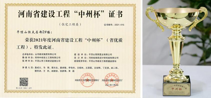 近日,河南省人力资源和社会保障厅、河南省住房和城乡建设厅共同颁发“2021年度河南省建设工程中州杯(省优质工程)奖”,D体育(中国)建设D体育(中国)河南公司承建的平顶山恒大名都2#楼喜获“中州杯”荣誉。这是河南省建设工程质量最高奖,代表着全省工程建设质量的最高水平。