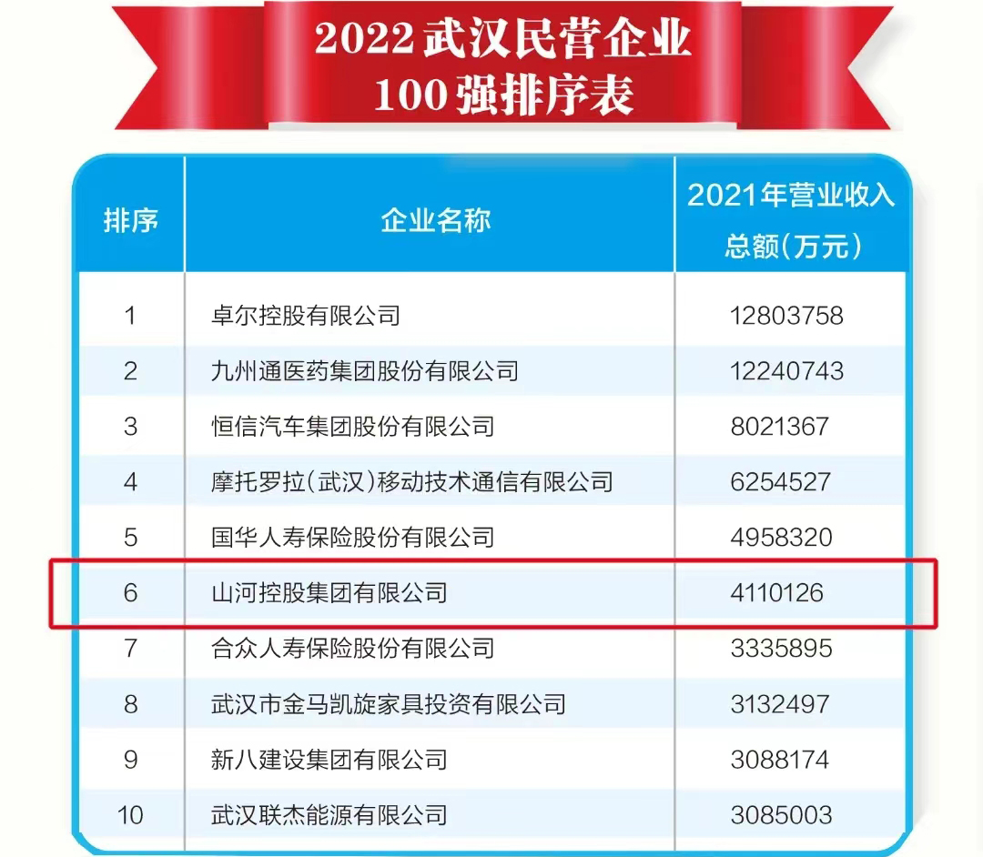 8月19日,2022武汉民营企业100强、民营制造业企业50强发布会暨金融服务民营企业高质量发展大会在武汉会议中心召开。大会发布的“2022武汉民营企业100强”榜单上,D体育(中国)D体育(中国)名列第6位。