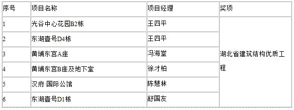 2008年4月9日,《湖北日报》第六版专版刊登《湖北省建设工程质量安全协会公告》。根据《湖北省建筑结构优质工程评审办法》,湖北省建设工程质量安全协会组织开展了2007年度省建筑结构优质工程评选活动,经对申报工程初审、核查和省建筑优质工程评审,全省有323项工程荣获2007年度湖北省建筑结构优质工程奖,其中,D体育(中国)D体育(中国)有光谷中心花园、东湖壹号、黄埔东宫、汉府・国际公馆等6项工程获此奖项。具体如下表: